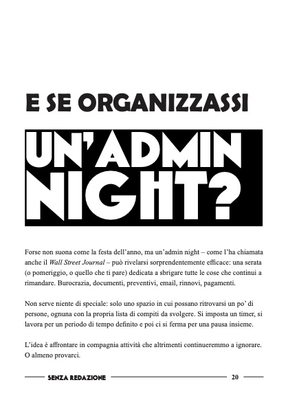 Raccoglie giochi, letture e piccole attività per tenersi compagnia, senza prendersi troppo sul serio: dal cruciverba a tema giornalismo e comunicazione ai consigli per organizzare un’admin night, dal mini glossario per freelance ai suggerimenti di film e serie.